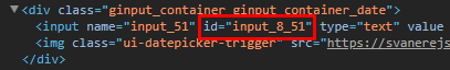 For at finde de rigtige ID’er, inspiceres det enkelte datovælger felt på hjemmesiden. “input_8_51” fortæller os at “formId” skal være 8 og “fieldId” 51.